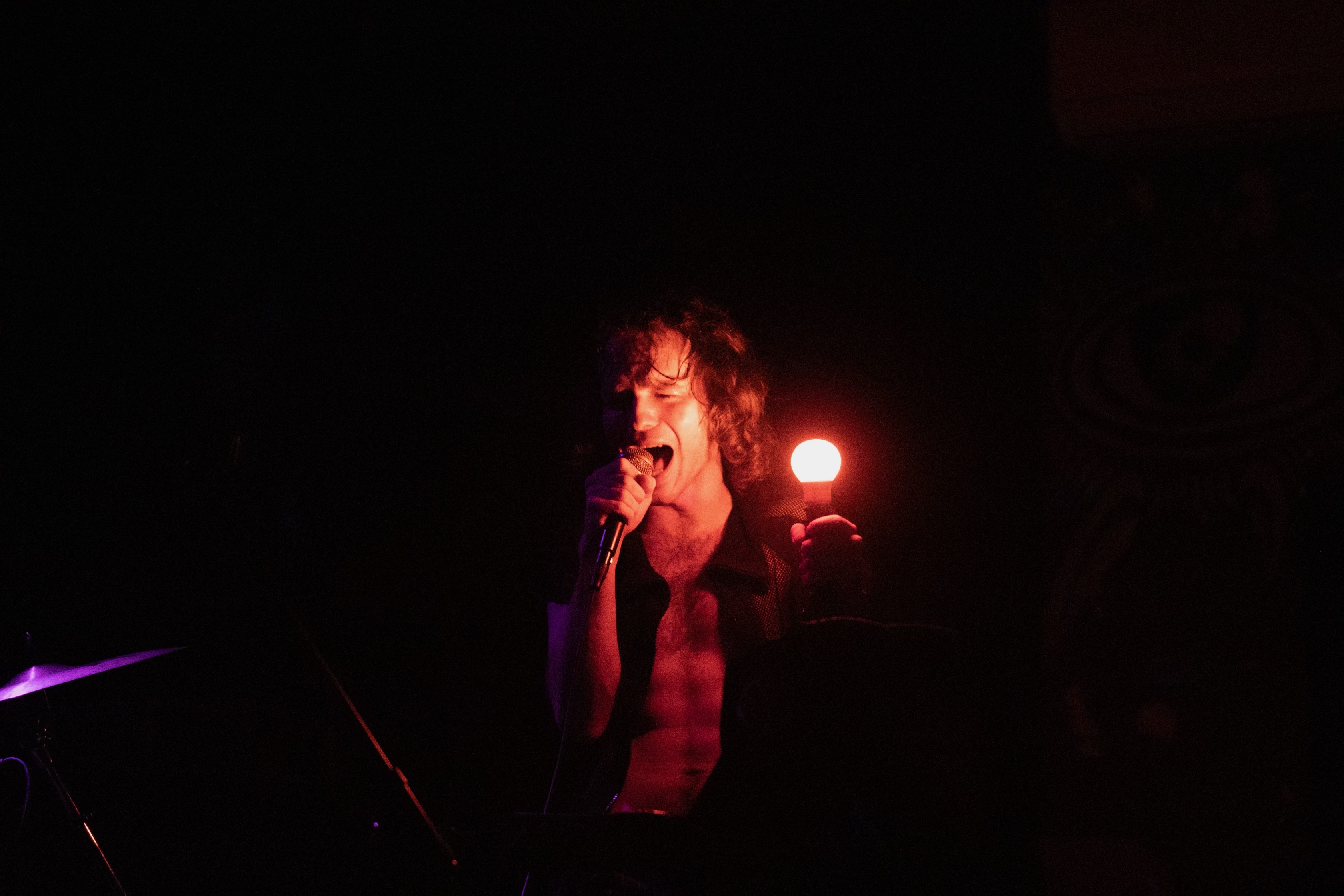 in reality, it is a retro-futurist/hypnagogic pop/gothic cosmic/experimental project that aims, in its recording, to create strange, uniquely designed danceable music with subtle key changes and strange forms (e.g., the Steve Reich inspired 7 chord carousel of "MY MIRROR"). in live form, it attempts a more literal approach to the "disco ex machina" concept, mixing in hidden backing tracks masked as archaic technology, using guests both musical and non musical to illustrate or else interrupt the performance, and overall create a Brechtian sense of awareness of artifice, as if the fictional frontman is singing despite the theatrical bounds placed upon him, triumphing over the elaborate stage show and his own fragile and frazzled identity with the purity of polyphonic harmony and infectious rhythm, turning gothic anthems into mosh pits and hyperrock attacks into cathartic performance.